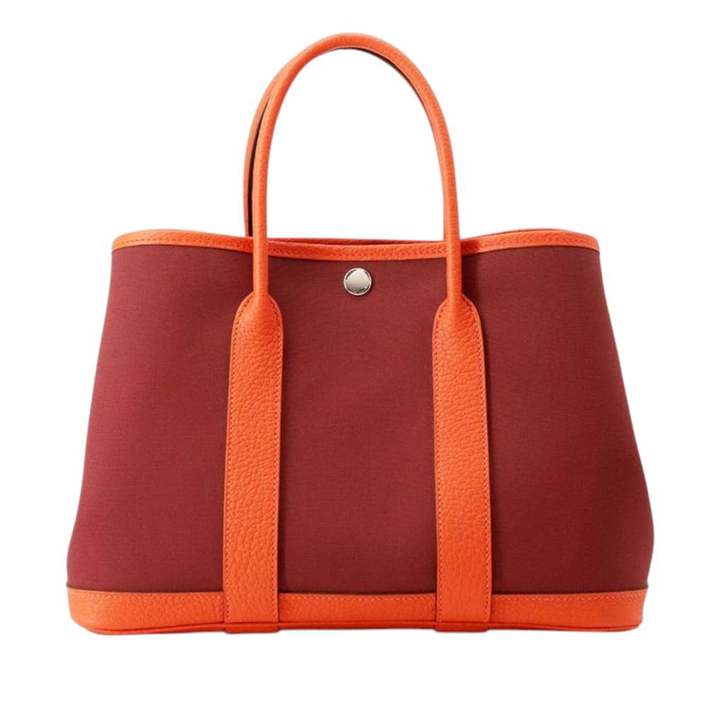 This Garden Party 30 features a canvas body in Rouge Grenat color with Negonda leather trim in Orange Poppy color, rolled leather handles, and an open top with snap button closure.
