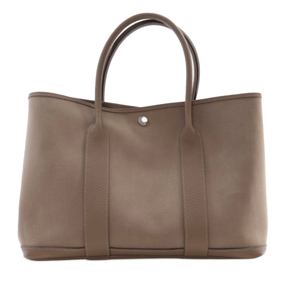 This Garden Party features a canvas body with leather trim in Etoupe color, rolled leather handles, and an open top with snap button closure.
