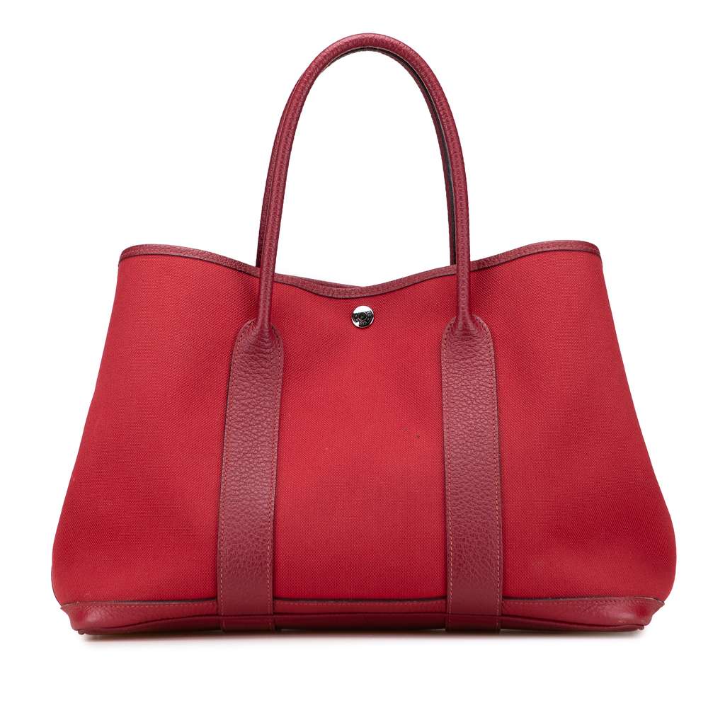 This Garden Party features a canvas and Negonda leather body, rolled leather handles, and an open top with snap button closure.