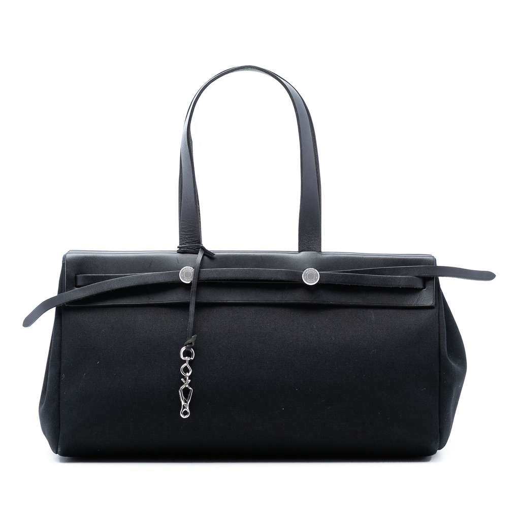 The Herbag Cabas tote bag features a canvas body, a top leather detail and straps, top magnetic closures, and an interior slip pocket.