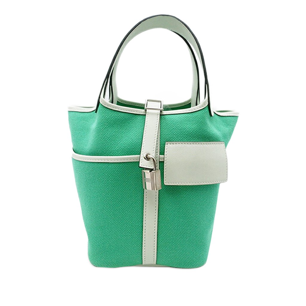 This Cargo Picotin Lock 18 features a canvas body with leather trim in Vert Comics and Vert Fizz colors, flat leather handles, an open top with a leather pull-through strap and padlock closure, and exterior slip and flap pockets.