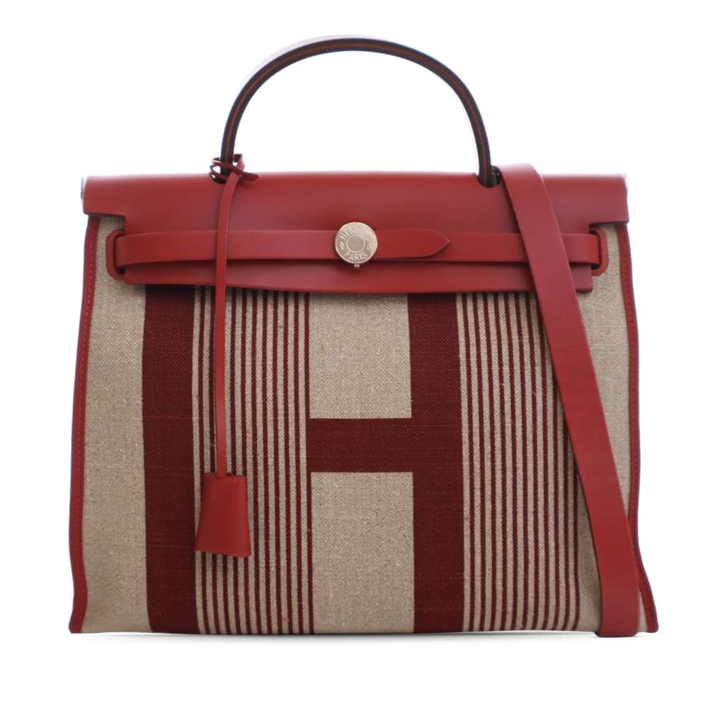 This Herbag Zip 31 features a canvas body with leather trim in Ficelle, Bordeaux, and Rouge Piment colors, a flat leather top handle, a flat leather shoulder strap, a front leather flap with pull-through strap closure, an exterior back zip pocket, and a detachable interior zip pouch.