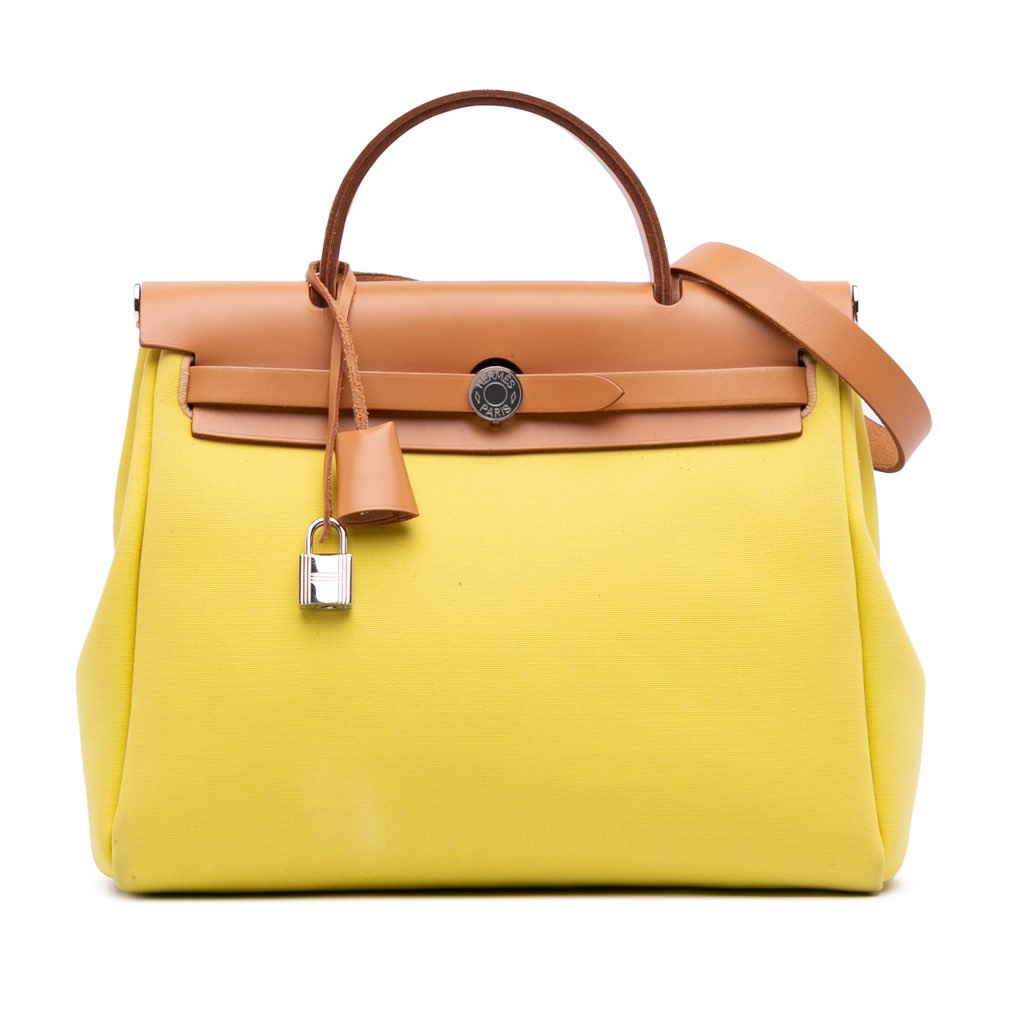 The Herbag Zip 31 features a canvas body with leather trim, a flat leather top handle, a flat leather shoulder strap, a front flap with pull-through strap closure, an exterior back zip pocket, and a detachable interior zip pouch.