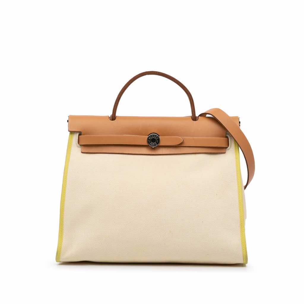 The Herbag Zip 31 features a canvas body with leather trim, a flat leather top handle, a flat leather shoulder strap, a front flap with pull-through strap closure, an exterior back zip pocket, and a detachable interior zip pouch.