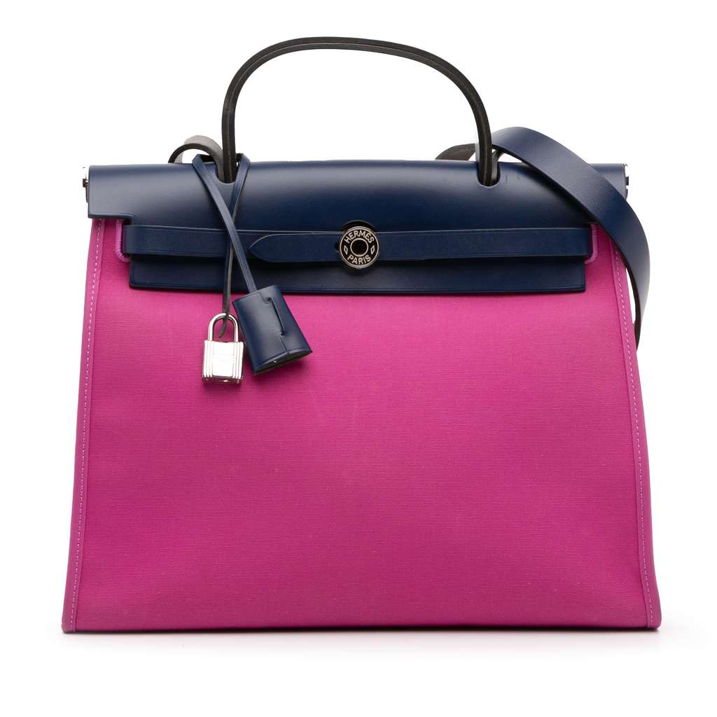 The Herbag Zip 31 features a canvas body with leather trim, a flat leather top handle, a flat leather shoulder strap, a front flap with pull-through strap closure, an exterior back zip pocket, and a detachable interior zip pouch.