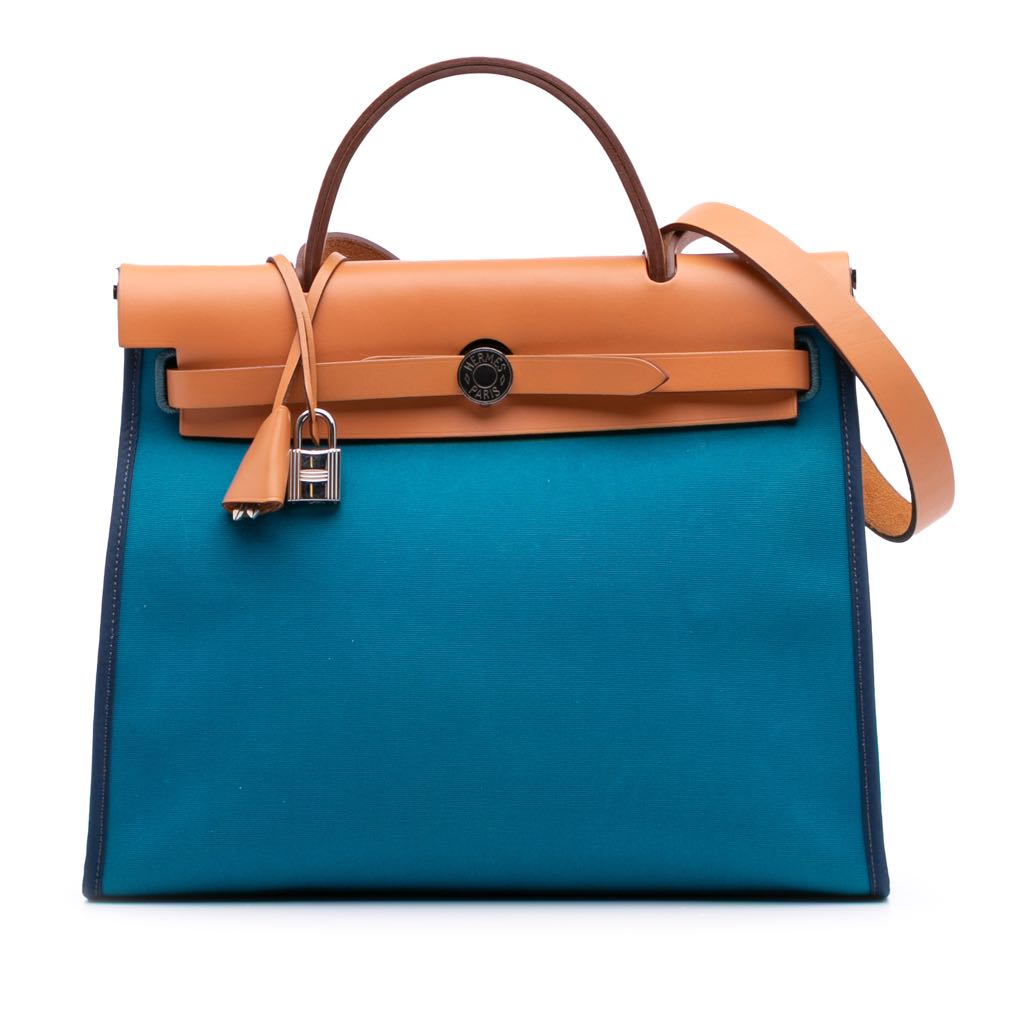 The Herbag Zip 31 features a canvas body with leather trim, a flat leather top handle, a flat leather shoulder strap, a front flap with pull-through strap closure, an exterior back zip pocket, and a detachable interior zip pouch.