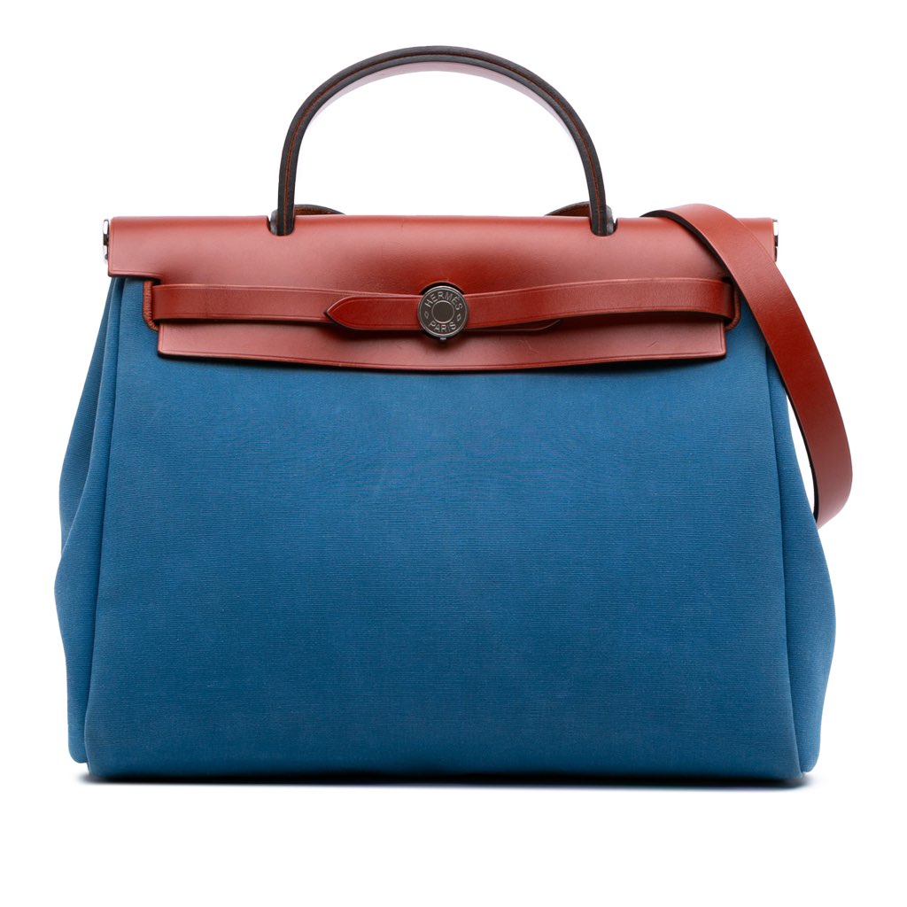 The Herbag Zip 31 features a canvas body, a flat leather top handle, a flat leather shoulder strap, a front leather flap with pull-through strap closure, an exterior back zip pocket, and a detachable interior zip pouch.