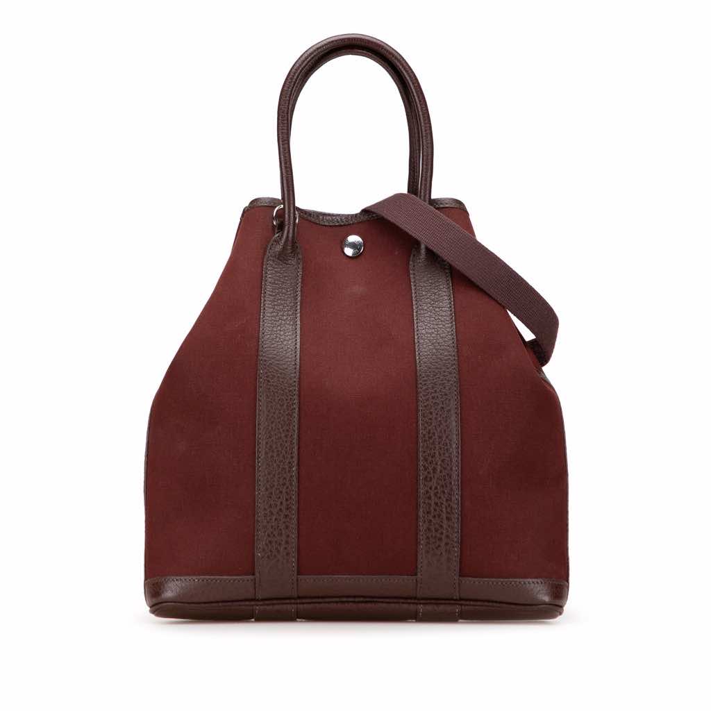 The Toile Garden File 28 features a canvas body with leather trim, rolled leather handles, a detachable flat strap, and an open top with a snap button closure.
