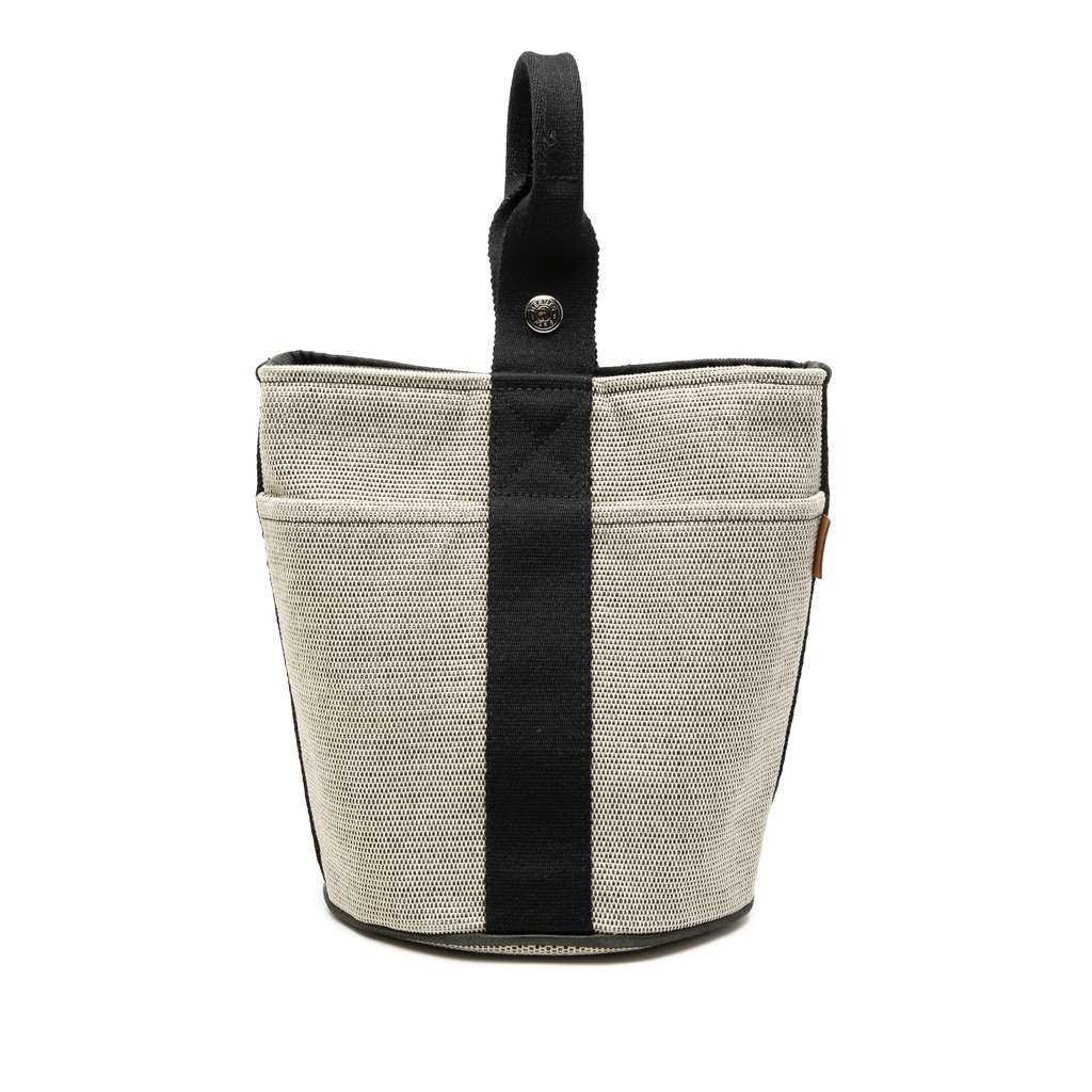 The Saxo PM features a canvas body, a flat strap, an open top with a magnetic snap button closure, exterior front and back slip pockets, and an interior zip pocket.