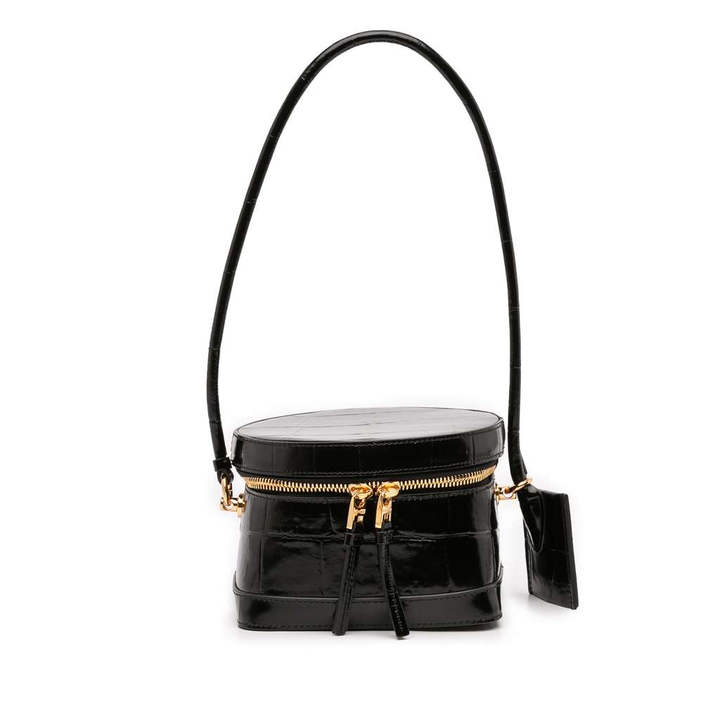 The Le Vanito features an embossed leather body, a rolled strap, a zip around closure, and an interior card slot.