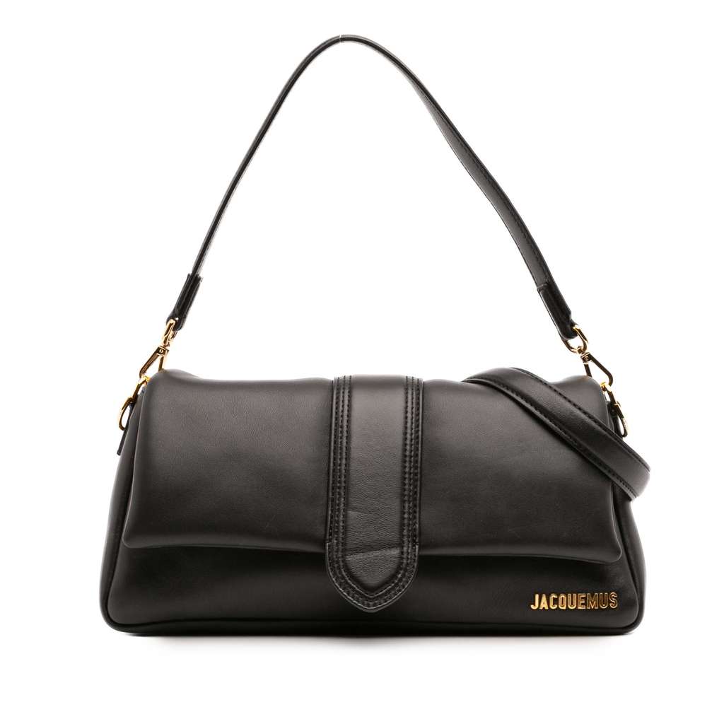 The Le Bambimou satchel features a lambskin leather body, a detachable flat leather handle, a detachable flat shoulder strap, a front flap with magnetic closure, an exterior back slip pocket, and an interior slip pocket.