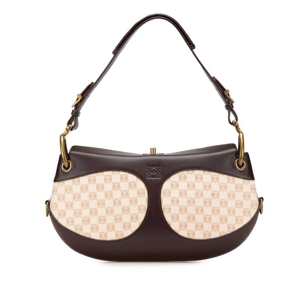 This shoulder bag features a calf leather and canvas body, a flat leather strap, a fold-over top with a turn lock closure, and interior zip and slip pockets.