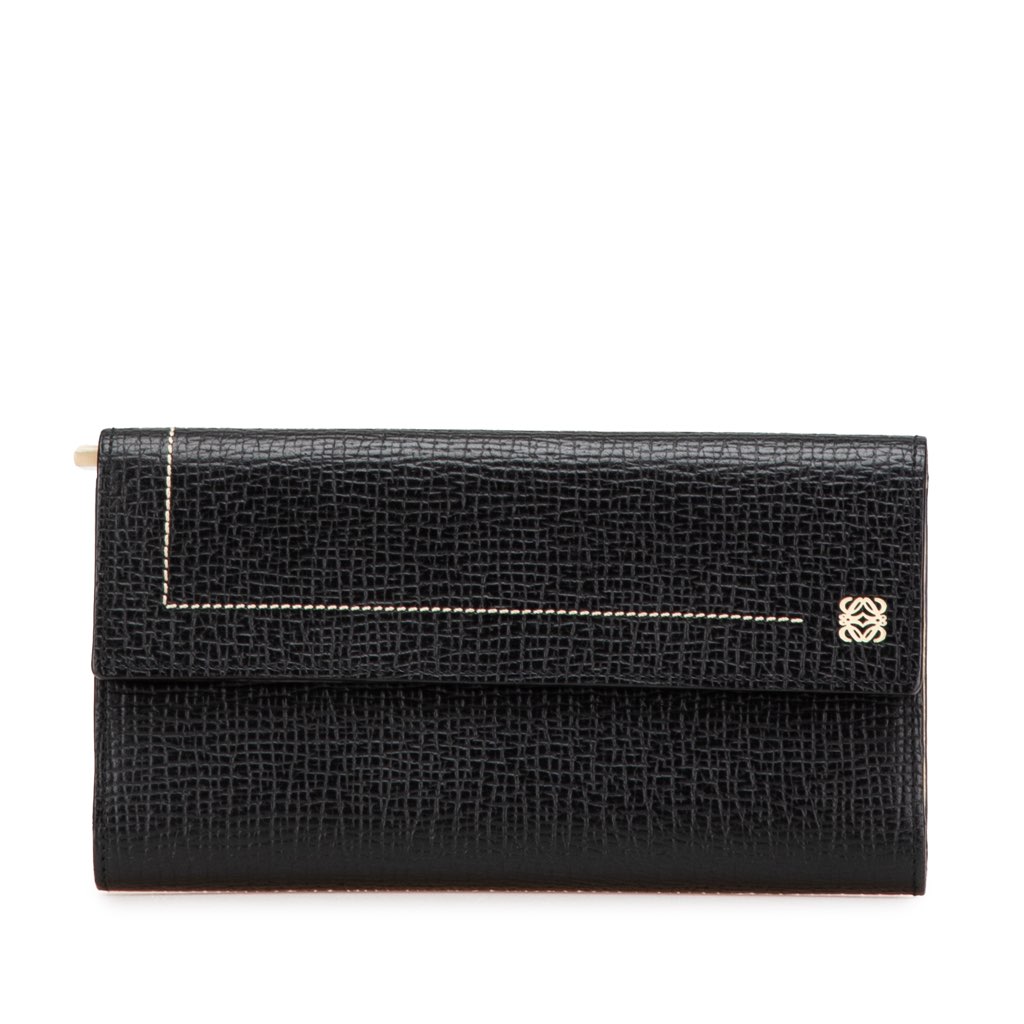 This long wallet features a leather body, a front flap with snap button closure, and interior zip and slip compartments.