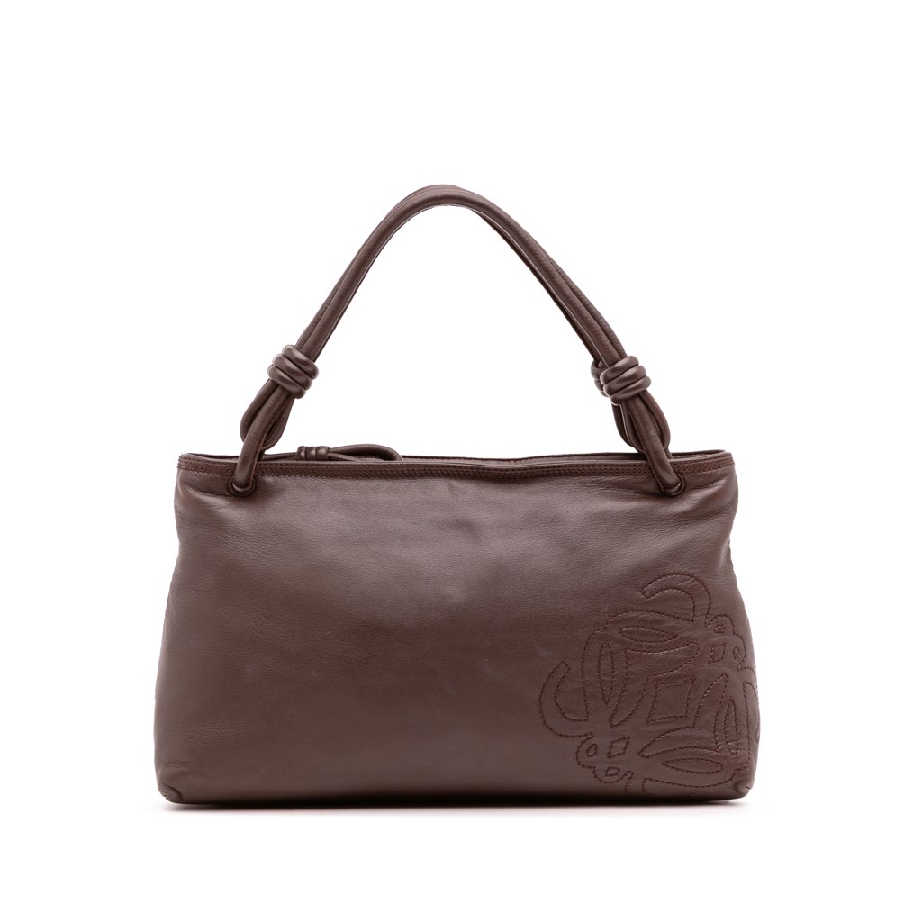 This handbag features a leather body, rolled leather handles, a top zip closure, and an interior zip pocket.