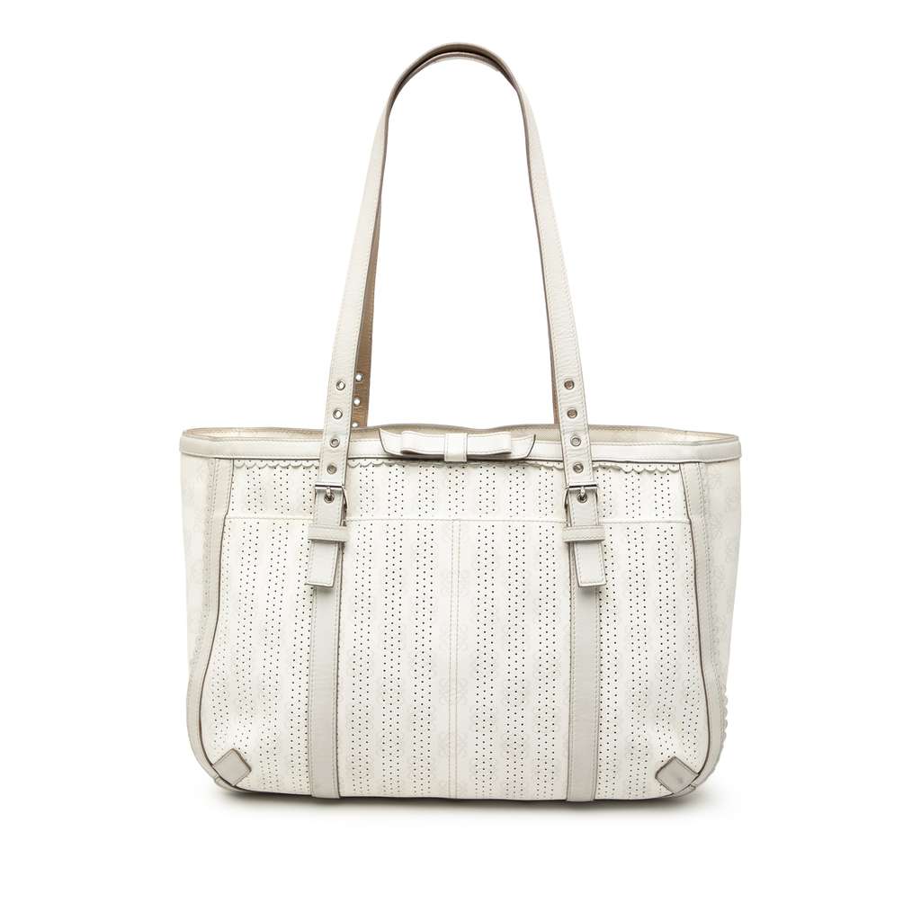 This tote bag features a perforated coated canvas body with leather trim, flat leather handles, a top zip closure, exterior slip pockets and an interior zip pocket.