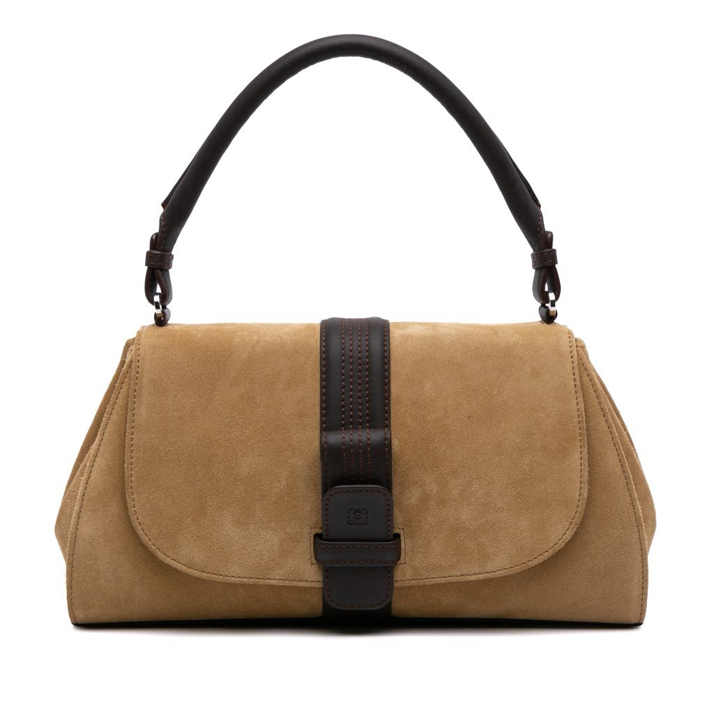 This handbag features a suede body, a rolled leather handle, a flap with pull through closure, and an interior zip pocket.