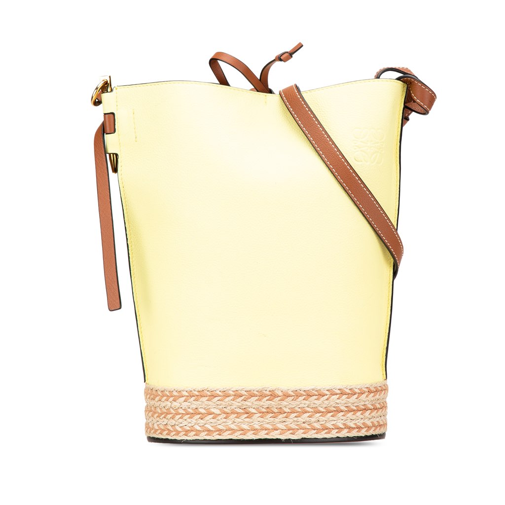 The Gate bucket bag features a bicolor leather body with raffia trim, a flat leather strap, an open top with tie closure, and interior slip pockets.