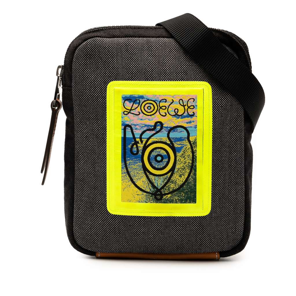 This crossbody bag features a printed canvas body, an adjustable shoulder strap, a top zip closure, and interior slip pockets.