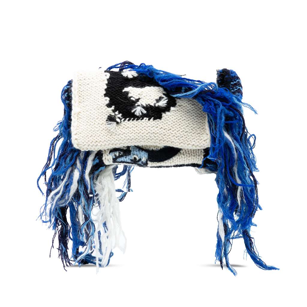 This crossbody features a knitted wool body with fringed details, a knitted shoulder strap, and a flap closure.