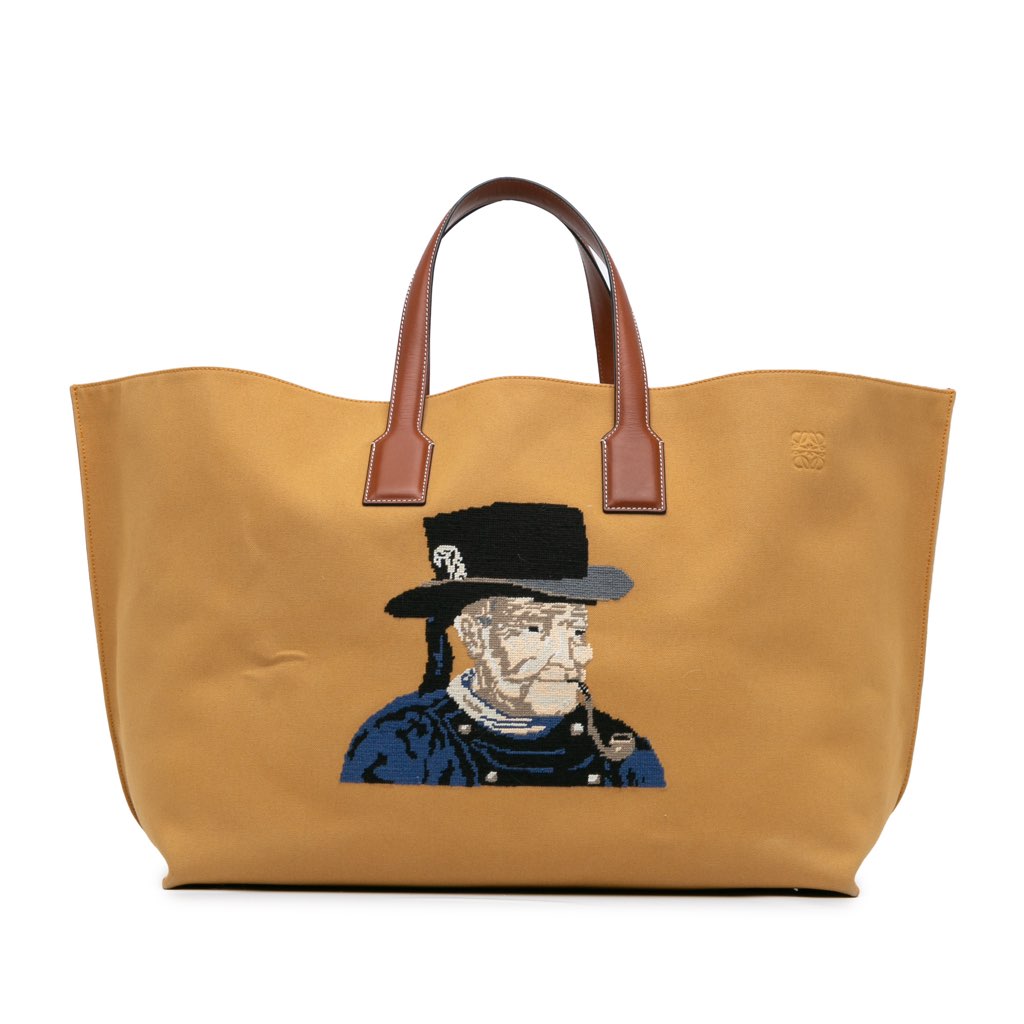 This tote features a canvas body, flat leather straps, an open top with magnetic snap closure, and a detachable zip pouch.