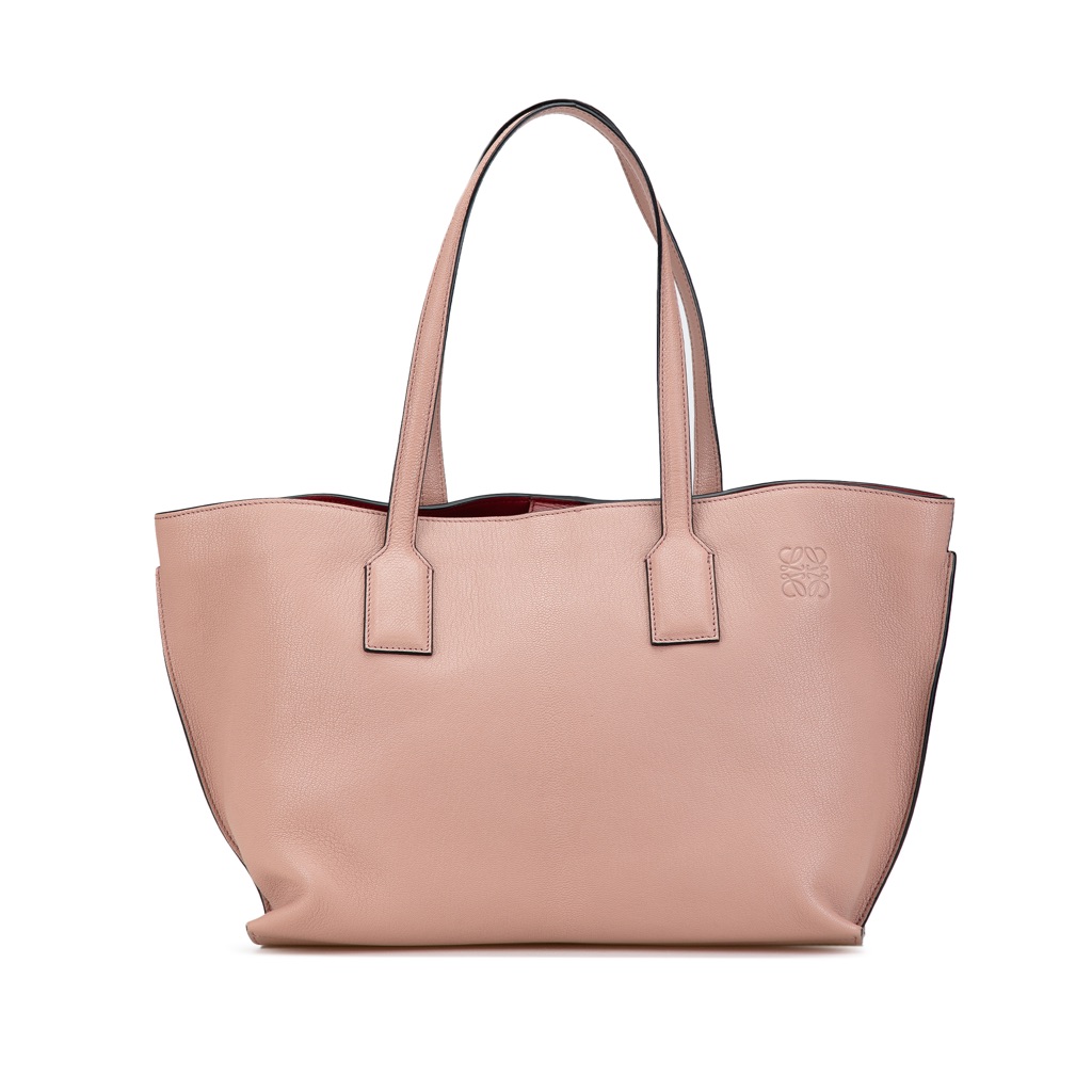 The T Shopper features a leather body, flat leather handles, and an open top with magnetic button closure.