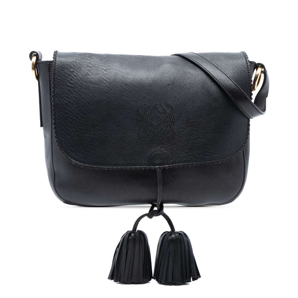 This crossbody bag features a leather body, a flat leather shoulder strap, a front flap with a snap button closure, a tassel detail, and an interior slip pocket.
