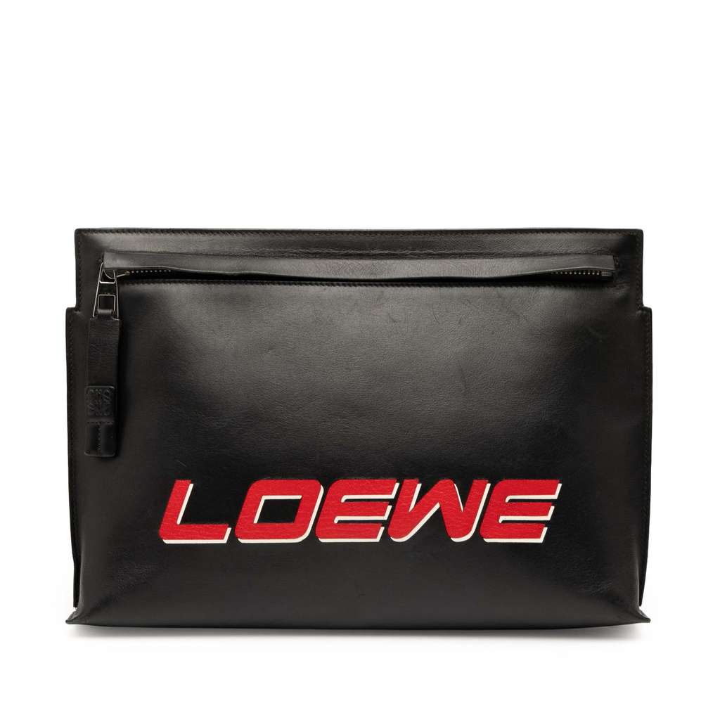 This clutch bag features a leather body, a top zip closure, and an interior slip pocket.