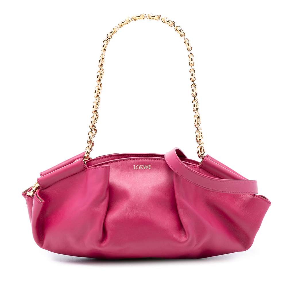 This satchel features a leather body, gold-tone curb chain handles, a detachable flat leather strap, and a top zip closure.