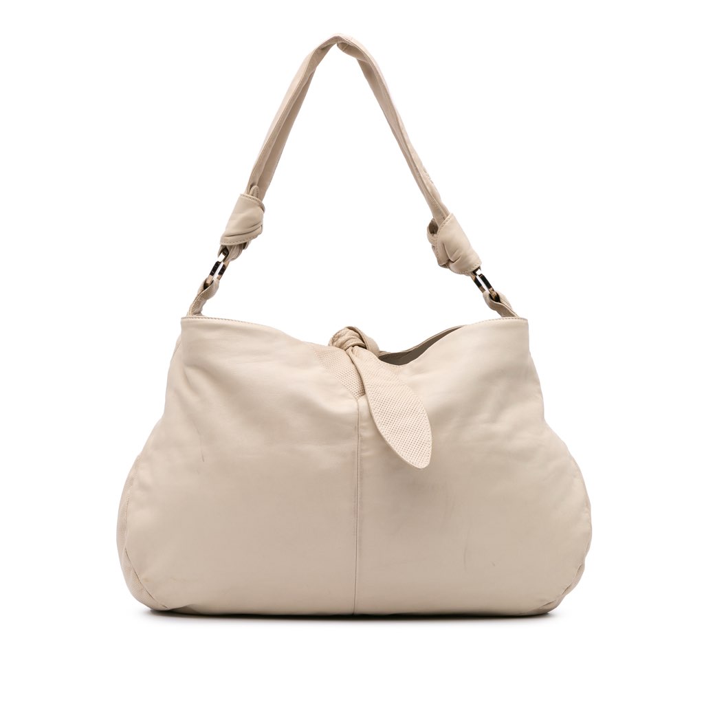 This shoulder bag features a leather body, a flat leather strap, an open top with leather tie closure, an interior zip compartment, and interior zip and slip pockets.