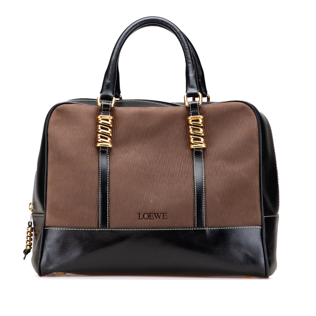 This travel bag features a leather body, rolled handles, a top zip closure, and an interior zip pocket.