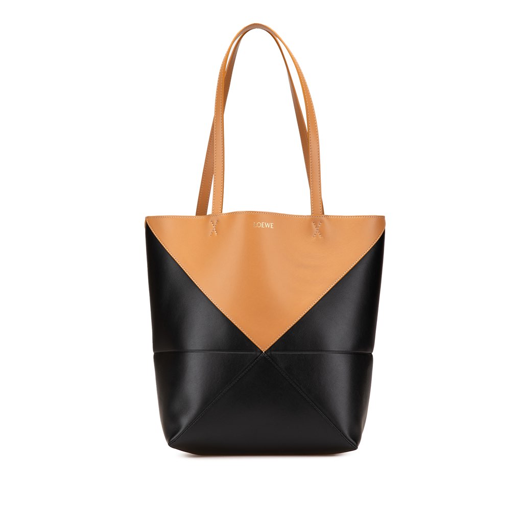 This tote bag features a leather body, flat leather straps, and an open top.