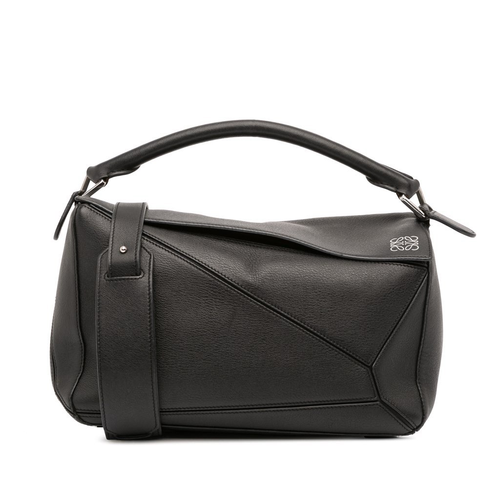 The Puzzle bag features a leather body, a rolled leather top handle, a detachable flat leather strap, a flap and top zip closure, an exterior back zip pocket, and interior slip pockets.