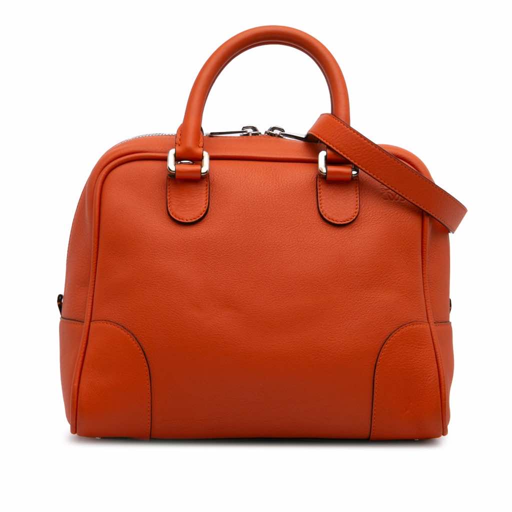 The Amazona satchel features a calfskin leather body, rolled leather handles, a detachable flat leather strap, a top zip closure, and an interior zip pocket.