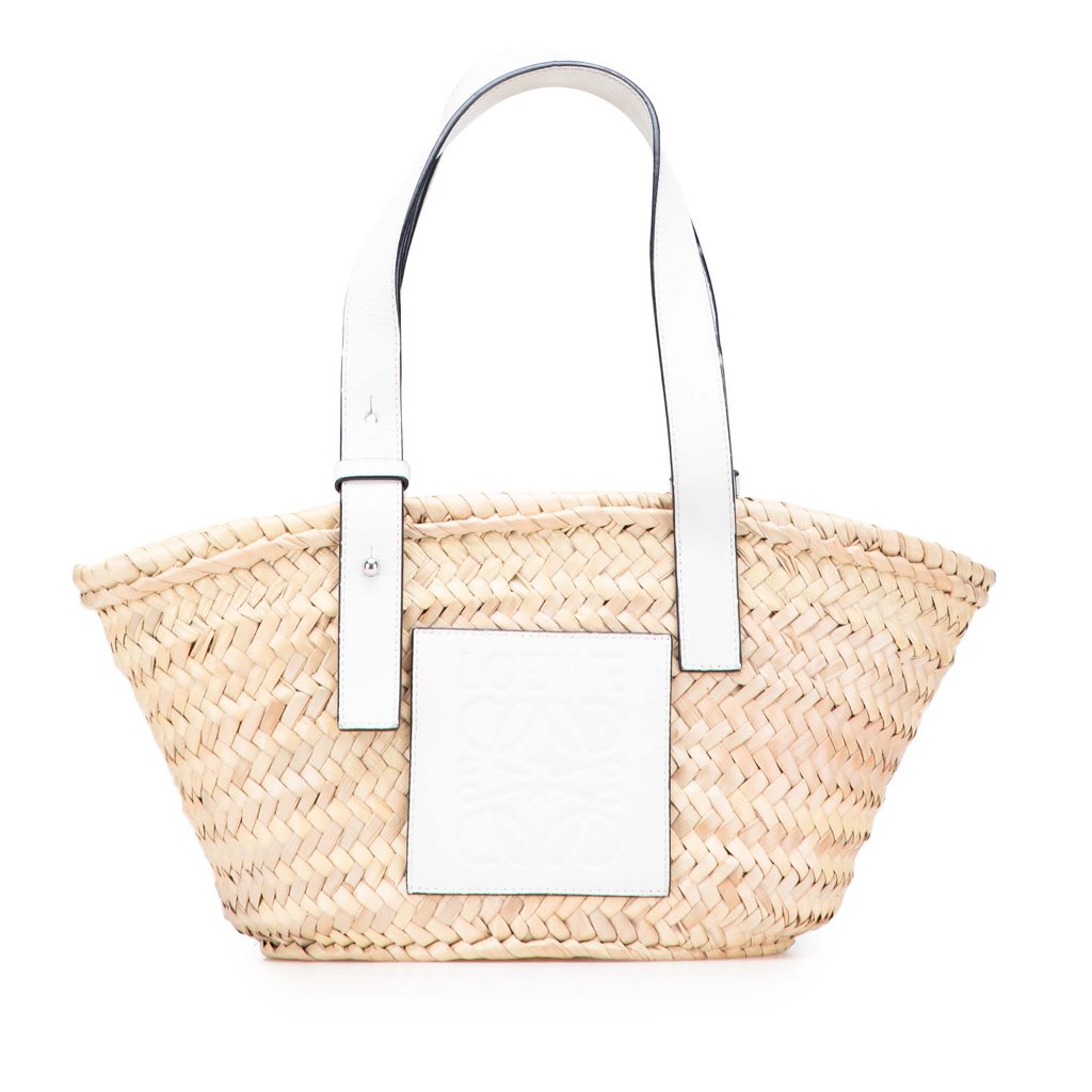 This tote bag features a raffia body, flat leather handles, and an open top.