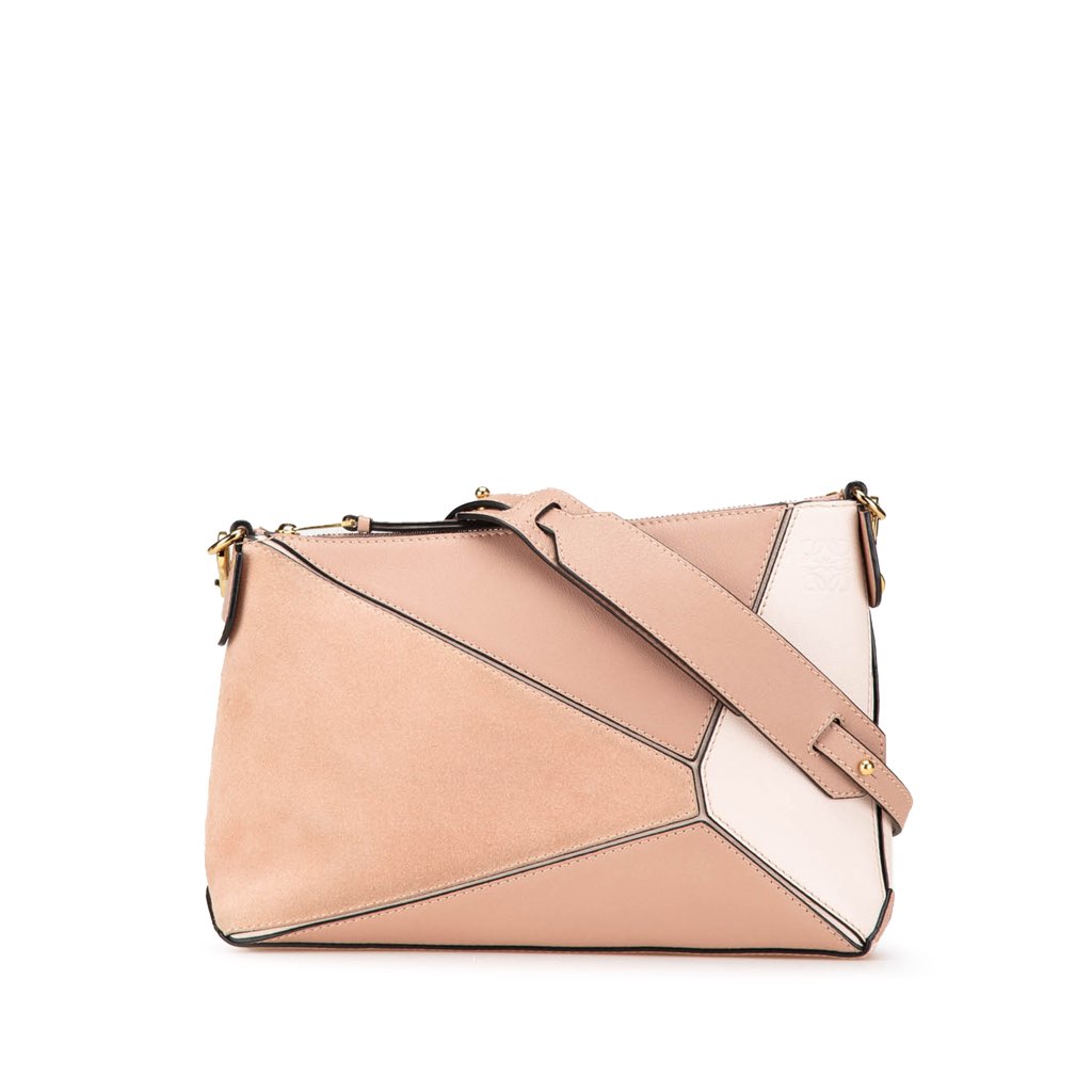The Puzzle features a leather and suede body, a detachable flat leather shoulder strap, a top zip closure, an exterior zip pocket, and an interior slip pocket.