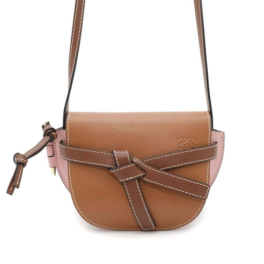 The Gate crossbody bag features a leather body, a flat leather strap, a front flap with knotted leather strap closure, and interior slip pockets.