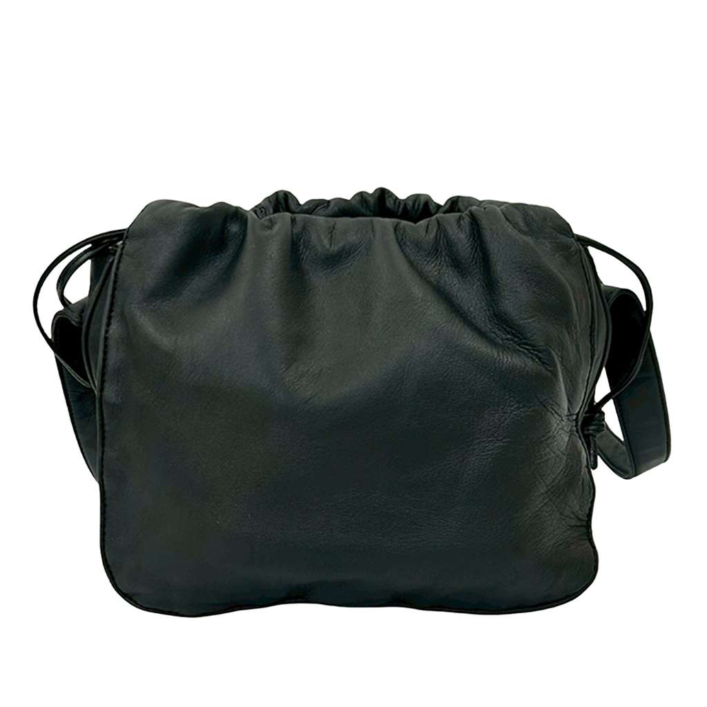 This crossbody bag features a leather body, a flat leather shoulder strap, an open top with drawstring and magnetic snap closure, and an interior zip pocket.