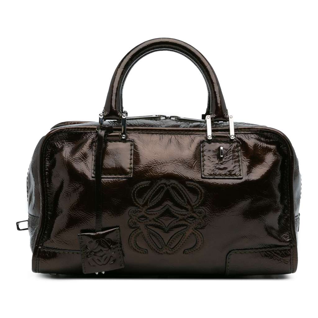 The Amazona 28 features a patent leather body, rolled leather handles, a top zip closure, and interior zip and slip pockets.