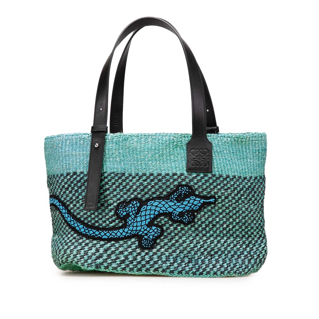This tote bag features a woven raffia body, flat leather straps, and an open top.
