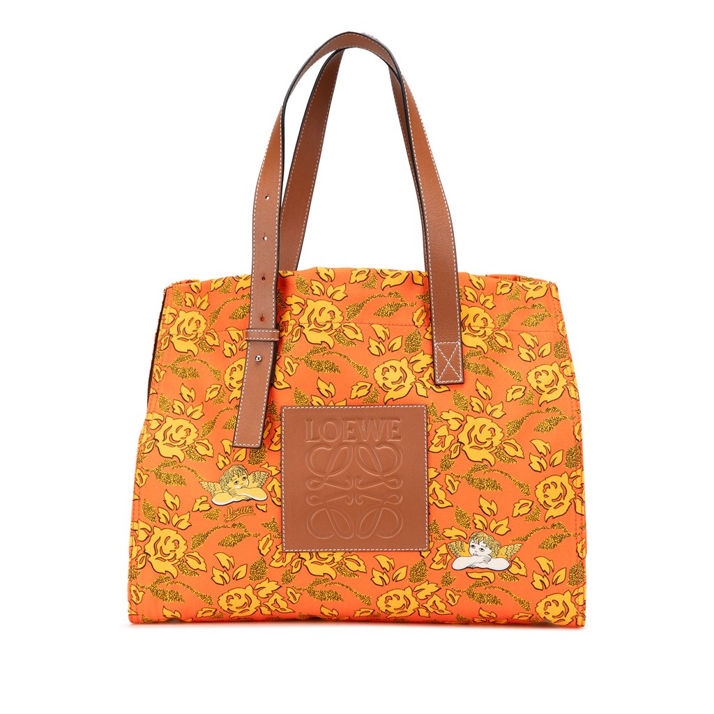 This tote bag features a printed canvas body, flat leather handles, an open top, and an interior zip pocket.