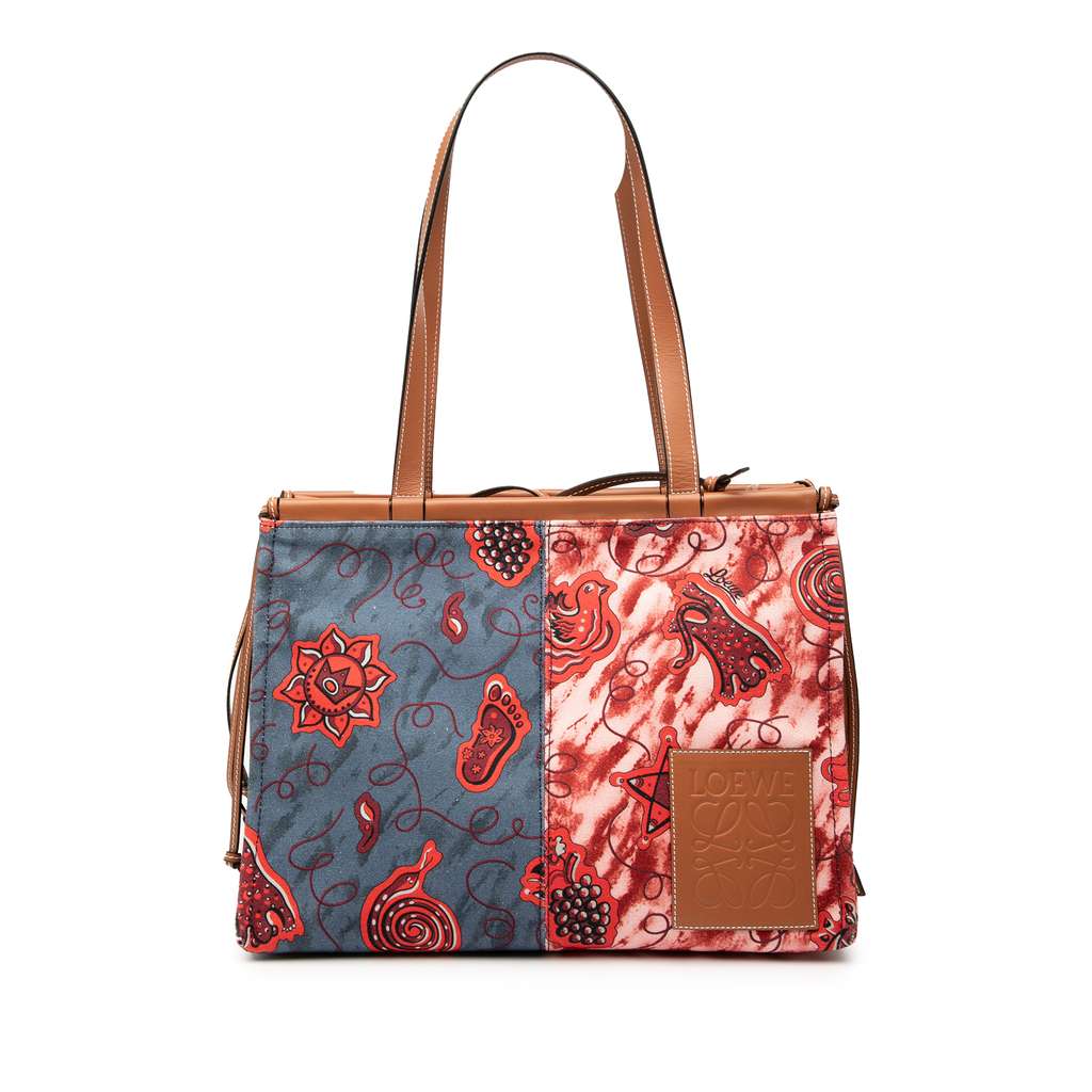 This tote bag features a printed canvas body with leather trim, flat leather straps, an open top, and interior slip pockets.
