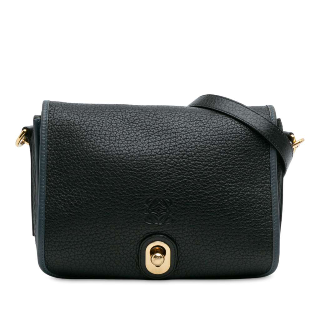 This flap features a leather body, an adjustable flat shoulder strap, a front flap with metal lock closure, and an interior slip pocket.