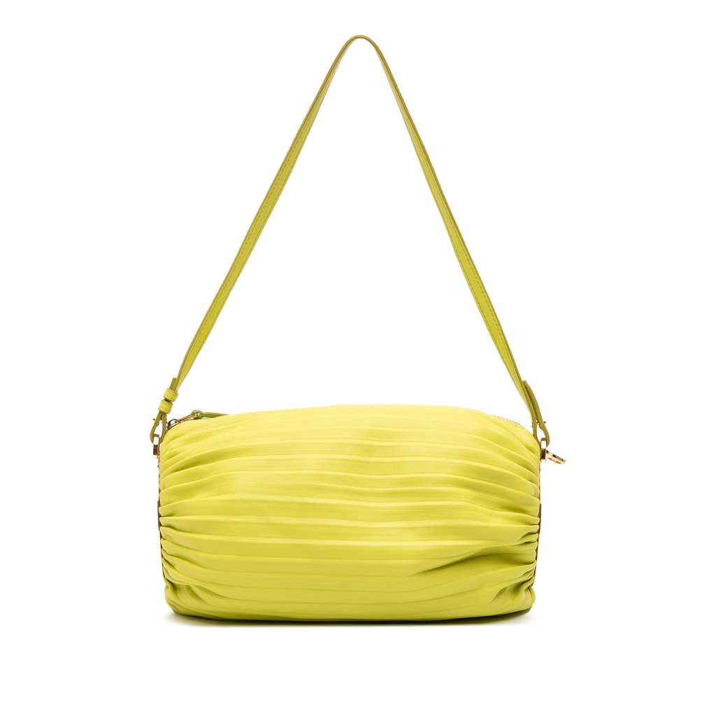 This shoulder bag features a pleated nappa leather body, a flat leather strap, and a top zip closure.