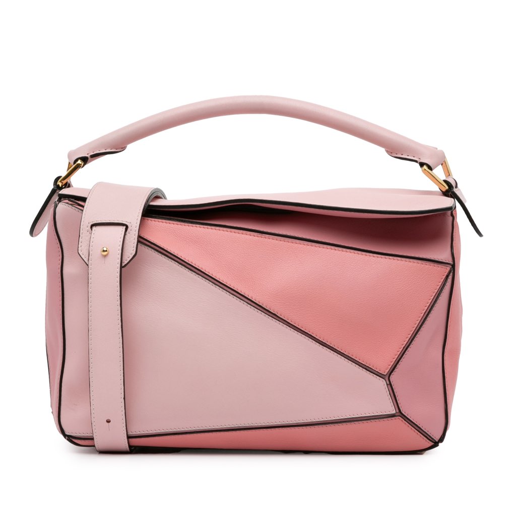 The Puzzle satchel features a leather body, a rolled top handle, an adjustable flat strap, a top zip closure, and an exterior zip pocket.