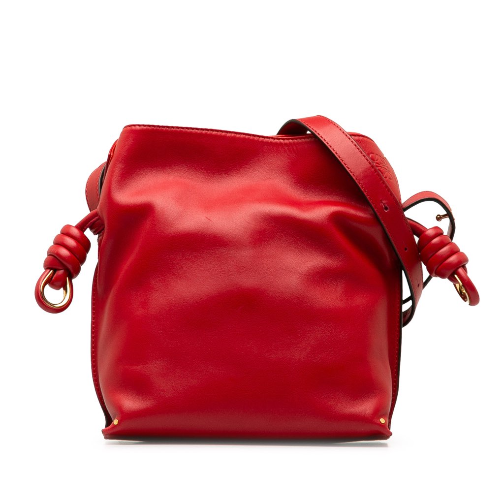 The Flamenco Knot features a leather body, a flat leather strap, an open top with magnetic snap closure, and interior zip and slip pockets.