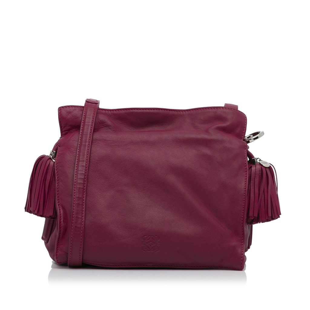 The Flamenco Knot crossbody bag features a leather body, an adjustable flat leather strap, tassel details, an open top with magnetic closure, and interior zip and slip pockets.