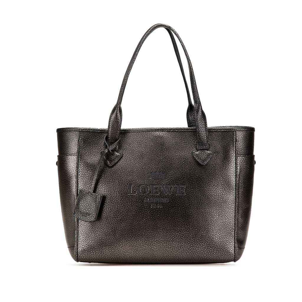 This tote bag features a leather body, flat leather handles, an open top with hook closure, exterior side pockets, and interior zip and slip pockets.