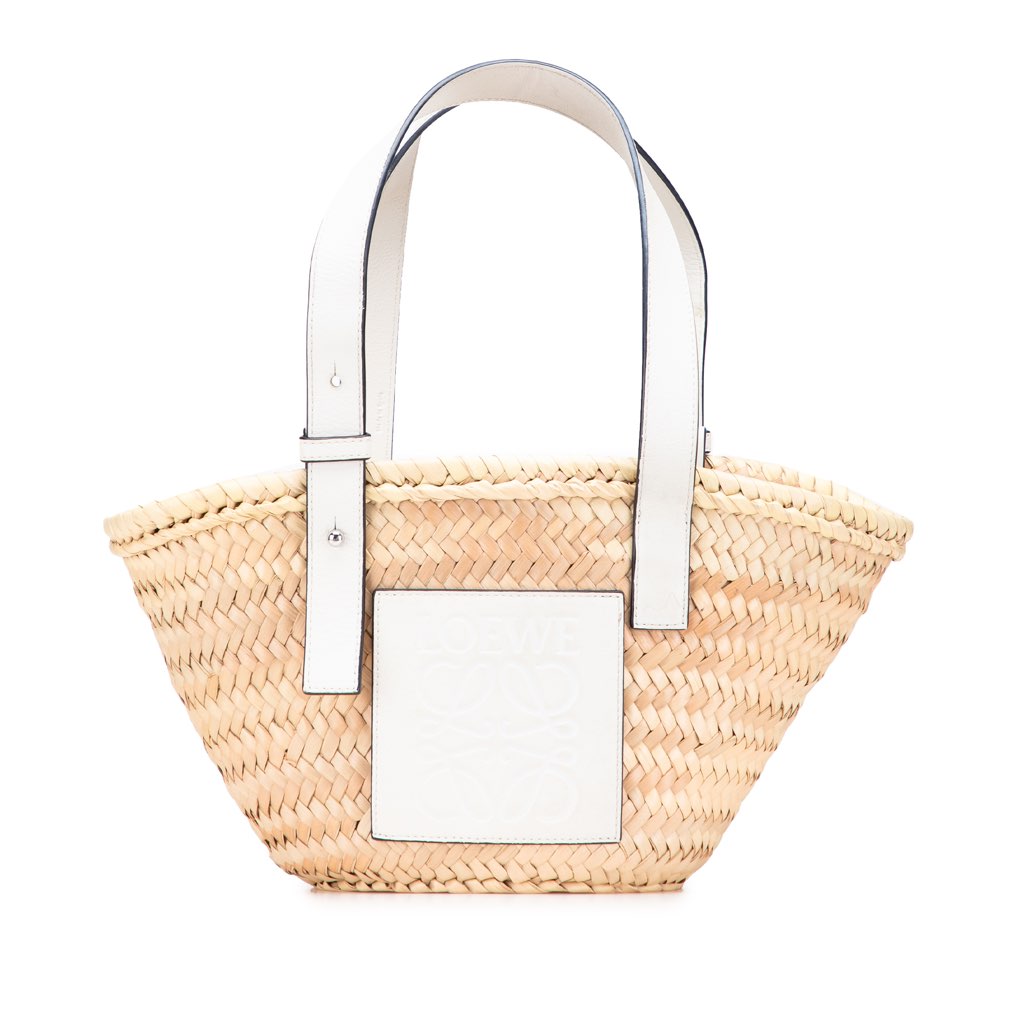 This tote bag features a raffia body, adjustable flat leather handles, and an open top.