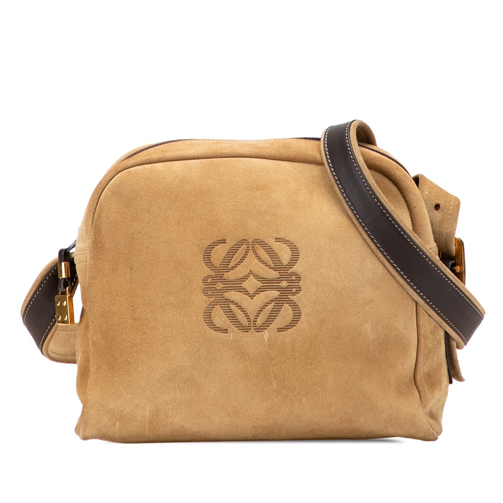 This crossbody bag features a suede body with leather trim, an adjustable flat leather strap, and a top zip closure.
