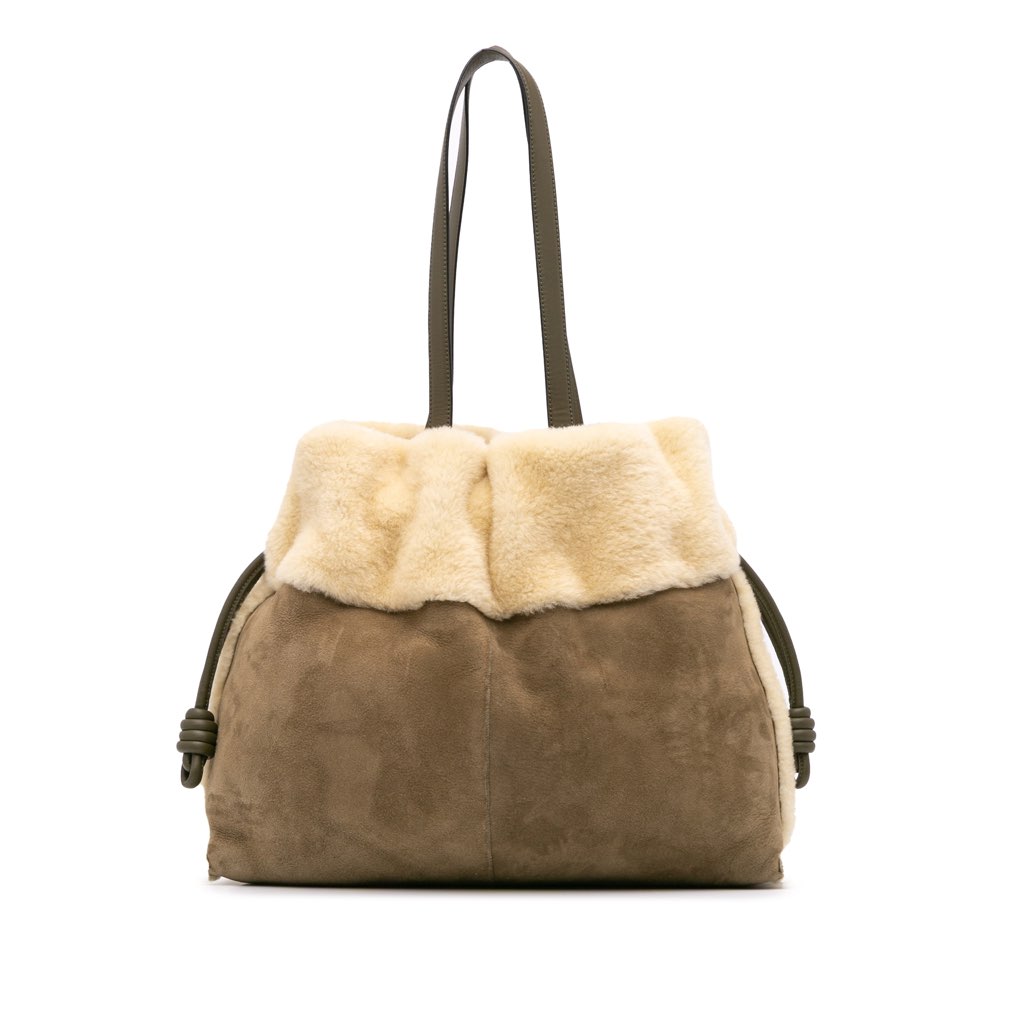 The Flamenco features a suede leather body with faux fur trim, flat leather straps, a magnetic button closure, and an interior zip pocket.